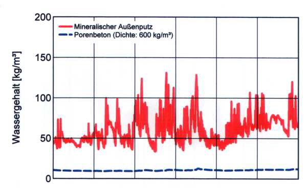 Die Aussenwände des aus Erdgeschoss und ausgebautem Dachgeschoss bestehenden Einfamilienhauses wurden aus 36,5 cm dicken Leichthochlochziegeln (Rohdichte 0,9 kg/dm3, Stossfugenverzahnung) mit Leichtmauermörtel LM 36 aufgemauert und mit Leichtmörtel verputzt. Der Rohbau war im April 1995 fertig und die Putzarbeiten im September 1995.