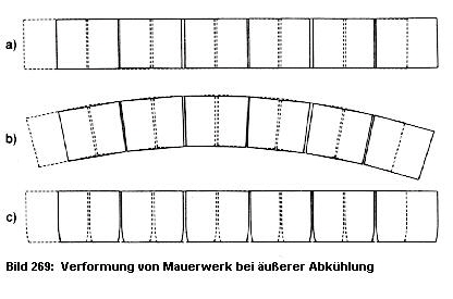 Die mehr senkrecht ausgebildeten Risse in Abb. 1, meist in Verbindung mit Fensteröffnungen, gehen auf die oben erwähnten Querkräfte in der Wandebene zurück bzw. auf Scherkräfte zwischen den belasteten Wandflächen und den unbelasteten unterhalb der Fenster. Die Mauerrisse müssen keine Putzrisse zur Folge haben, wenn der Putz eine gewisse "Entkopplungsfähigkeit" hat.