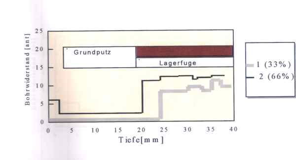 Ergebnis: Sowohl Ziegel wie auch Lagerfuge sind härter als der Grundputz. Der Oberputz ist jedoch härter als der Grundputz.