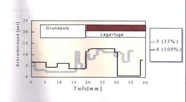 Die Versprünge (Kurve 4) geben die Ziegellochung wieder (kein Bohrwiderstand).