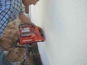 In Zusammenarbeit mit Dr. Eberhard Wendler wurden 2 durch Risse geschädigte Fassaden untersucht. Zur Untersuchung des Wandaufbaus setzt Dr. Wendler das vom Frauenhofer Institut für Bauphysik entwickelte Bohrgerät ein, welches die Härte der einzelnen Schichten über den Bohrwiderstand aufzeichnet. Der Anpressdruck wird über ein Gewicht erzeugt.